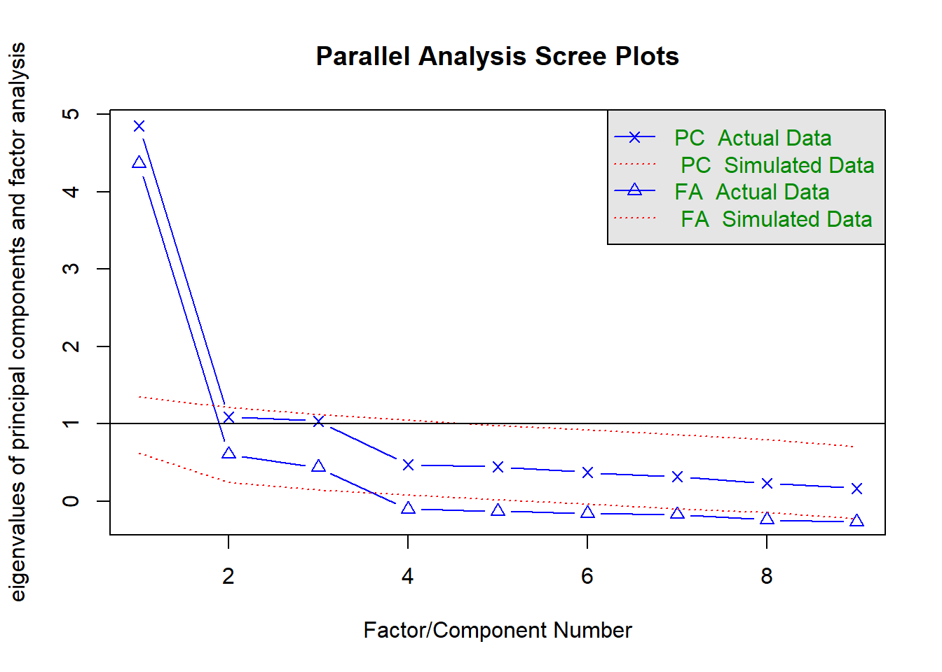 Remember that when interpreting the scree plot, you retain only the factors on the blue (real data) scree plot that are ABOVE the red (simulated random data) plot, in which we know there is no common variance, only random variance, i.e. “scree” (rubble).