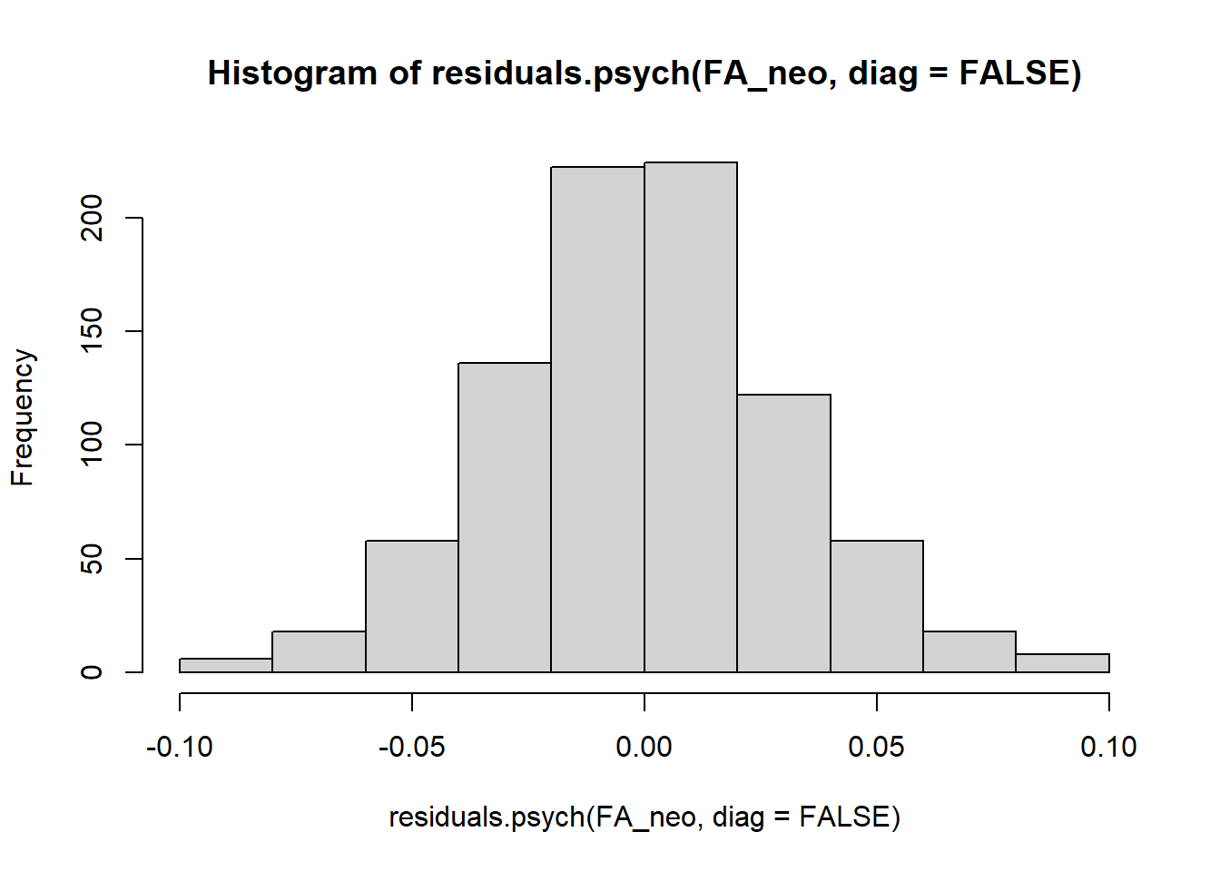 Q5. All residuals are very small (close to zero), and none are above 0.1 in absolute value. Since the 30x30 matrix of residuals is somewhat hard to eyeball, you can create a histogram of the values pulled by residuals.psych():