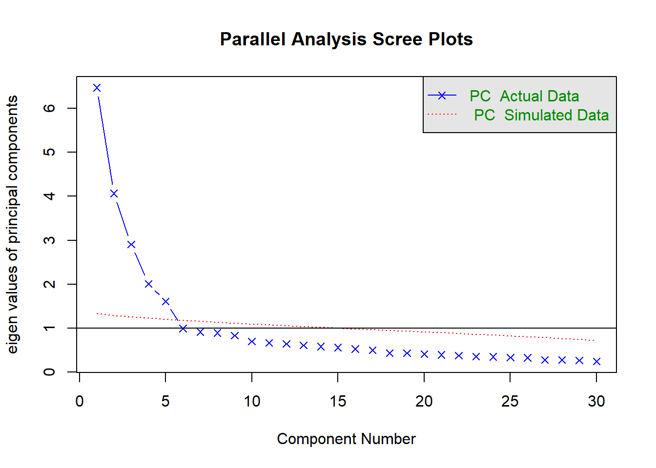 QUESTION 2. Examine the Scree plot. Does it support the hypothesis that 5 factors underlie the data? Why? Does your conclusion correspond to the text output of the parallel analysis function?