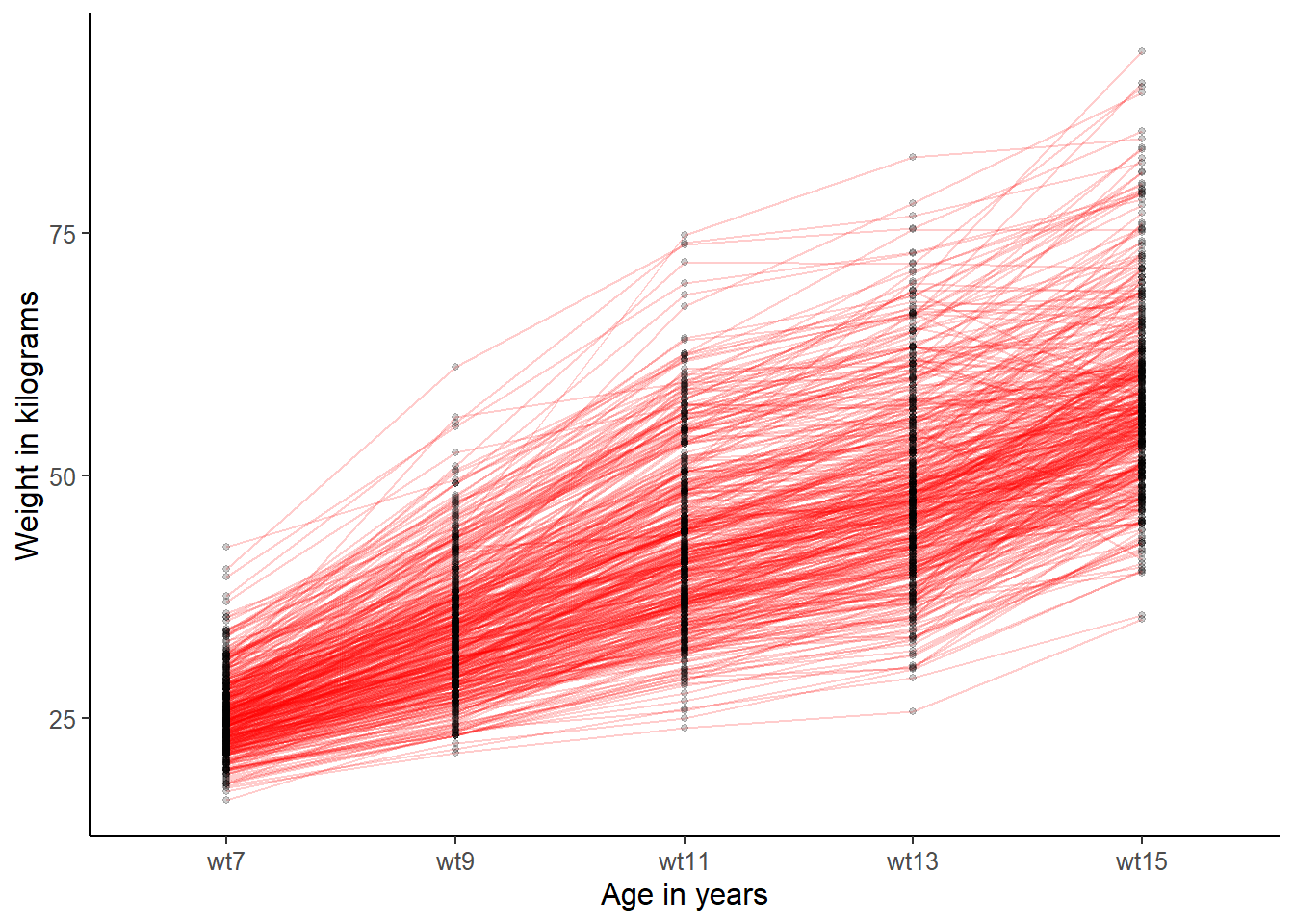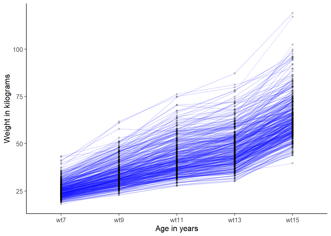 Each line on the graph represents a child, and you can see how weight of each child changes over time. You can see that there is strong tendency to weight increase, as you may expect, but also quite a lot of variation in the starting weight and also in the rate of change. You can perhaps see an overall tendency for almost linear growth between ages 7 and 11, but then slowing as children reach 13,and then a fast acceleration between 13 and 15 (puberty).