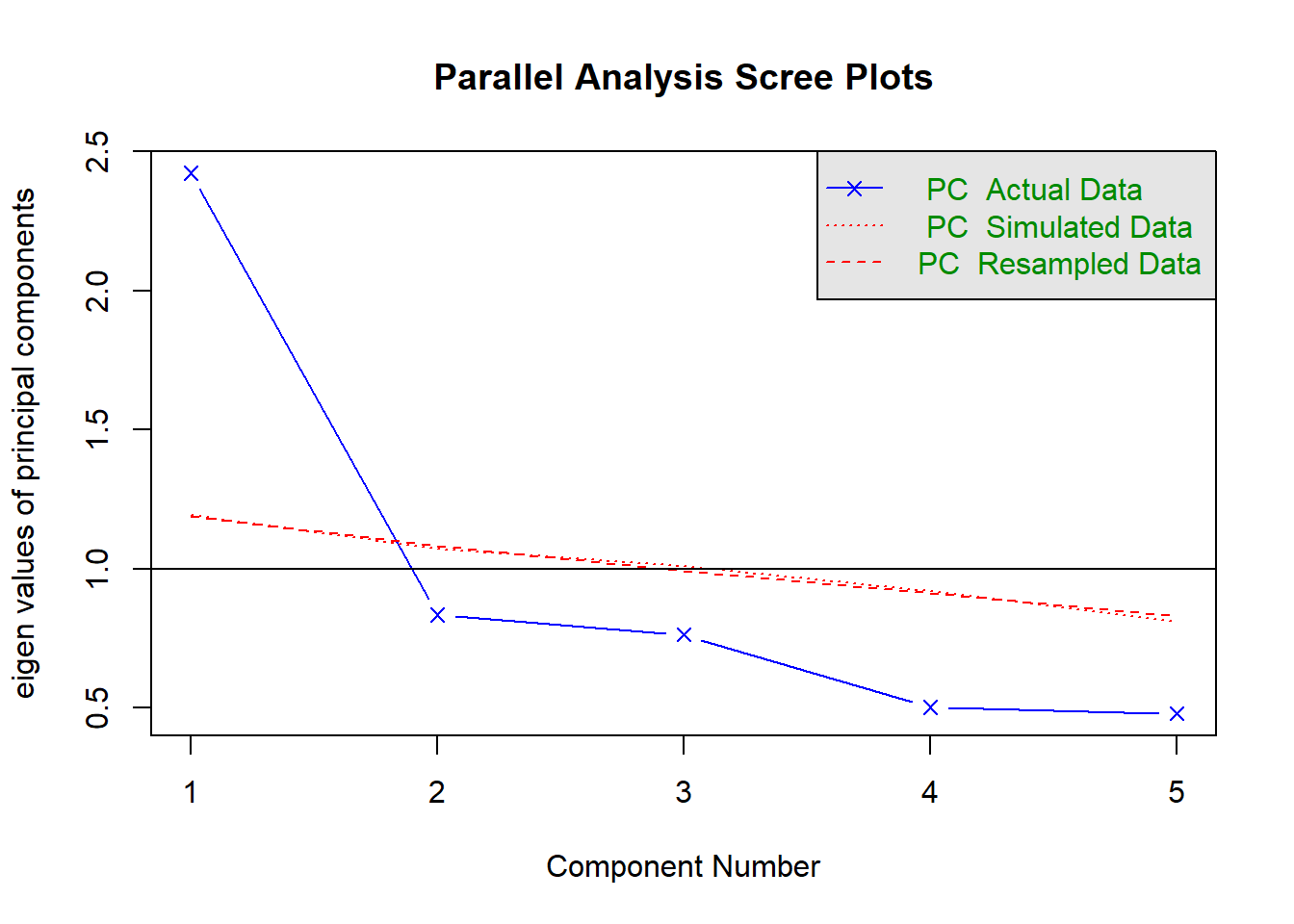 Package psych has a function producing Scree plots for the observed data and a simulated random (i.e. uncorrelated) data matrix of the same size. Comparison of the two scree plots is called Parallel Analysis. We retain factors from the blue scree plot (real data) that are ABOVE the red plot (simulated random data), in which we expect no common variance, only random variance. In Scree plots, important factors that account for common variance resemble points on hard rock of a mountain, and trivial factors only accounting for random variance are compared with rubble at the bottom of a mountain (“scree” in geology). While examining a Scree Plot of the empirical data is helpful in preliminary decisions on which factors belong to the hard rock and which belong to the rubble, Parallel Analysis provides a statistical comparison with the baseline for this size data.